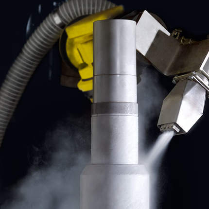 The process combines high velocity blown air and steam vapor. The air is heated up and is blown around the vapor jet. Because of the air velocity and the steam characteristics, the two media do not mix with one another and the air acts as a protection for the steam flow which is totally used for cleaning.